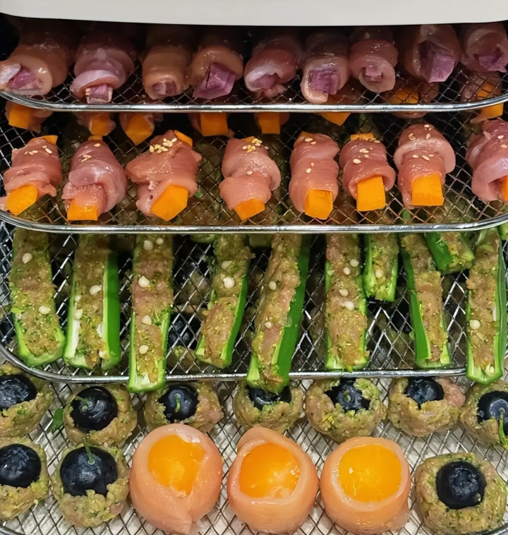 烘干之前的准备工作就已经很多了,烘干时间也很长,少说也要一两个小时,才能把肉干、果蔬干烘烤好。